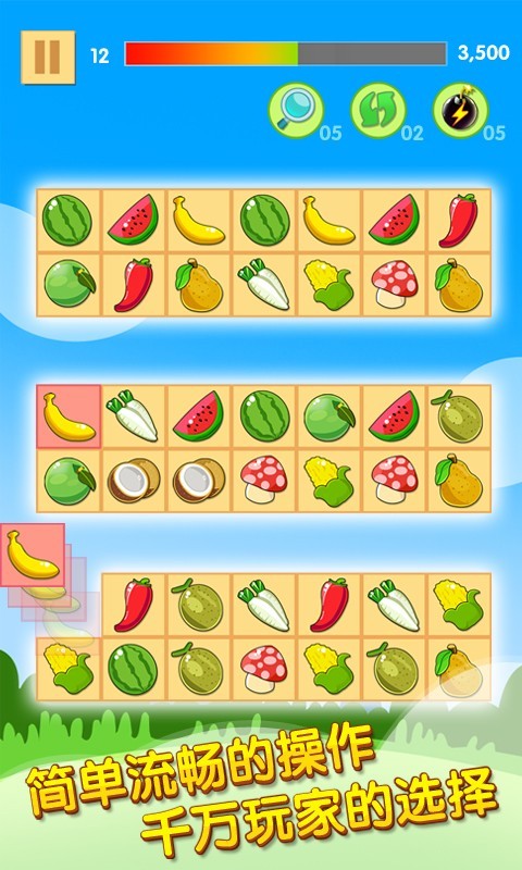 1.欢乐水果连连看是一款轻松休闲的手机游戏,它以经典的连连看玩法为基础,通过鲜艳的水果主题和丰富的关卡设计,为玩家带来了全新的游戏体验。无论是对新手还是资深玩家,欢乐水果连连看都能带来极大的乐趣和挑战。
